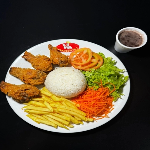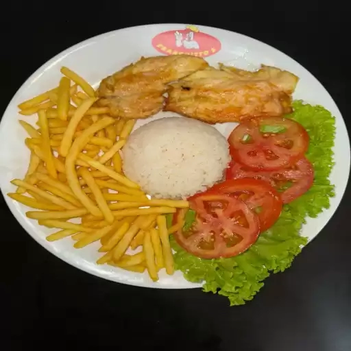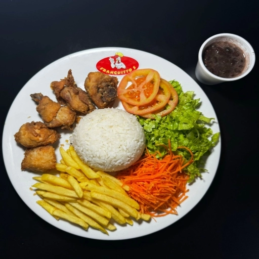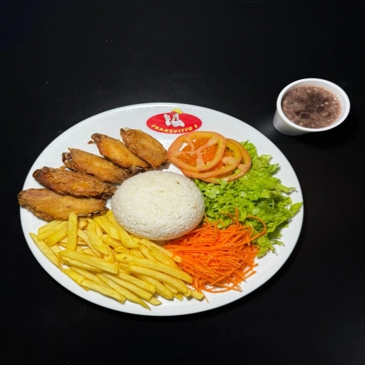 Frango á Passarinho 5 unidades + Arroz 200g + Salada + Batata-Frita 150g + Feijão 100ML